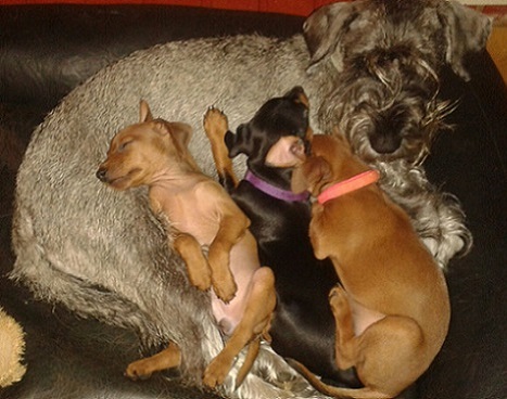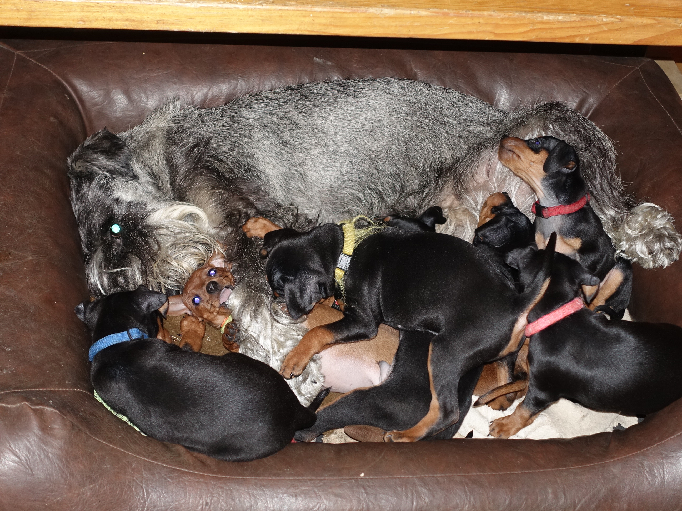 Neben Mama Chica, Tante Chérie und Papa Yoshi kümmerten sich auch die Schnauzerdamen Fay und ganz besonders Hanka um klein Printe und die gesamte